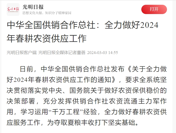 日前,中華全國(guó)供銷(xiāo)合作總社發(fā)布《關(guān)于全力做好2024年春耕農(nóng)資供應(yīng)工作的通知》,要求全系統(tǒng)堅(jiān)決貫徹落實(shí)黨中央、國(guó)務(wù)院關(guān)于做好農(nóng)資保供穩(wěn)價(jià)的決策部署,充分發(fā)揮供銷(xiāo)合作社農(nóng)資流通主力軍作用,學(xué)習(xí)運(yùn)用“千萬(wàn)工程”經(jīng)驗(yàn),全力做好春耕農(nóng)資供應(yīng)服務(wù)工作,為奪取夏糧豐收打下堅(jiān)實(shí)基礎(chǔ)。